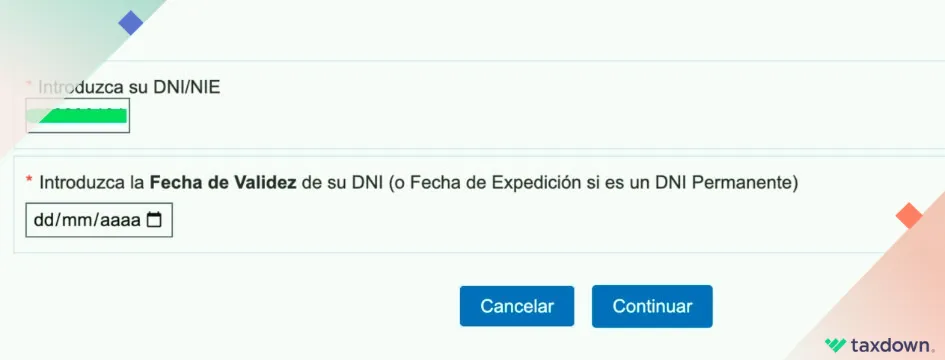 Una vez hagas click, te aparecerá la siguiente pantalla, en la que tendrás que introducir tu DNI o NIE, además de su fecha de validez.