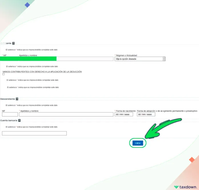 A continuación, te aparecerá el modelo 140. Como puedes observar, tendrás que introducir tu DNI o NIE, tus nombres y apellidos, elegir el régimen o la mutualidad, además de los datos de tu descendiente (tu hijo/a). Al final, donde pone ‘Cuenta bancaria’, tan solo tendrás que introducir tu IBAN.
